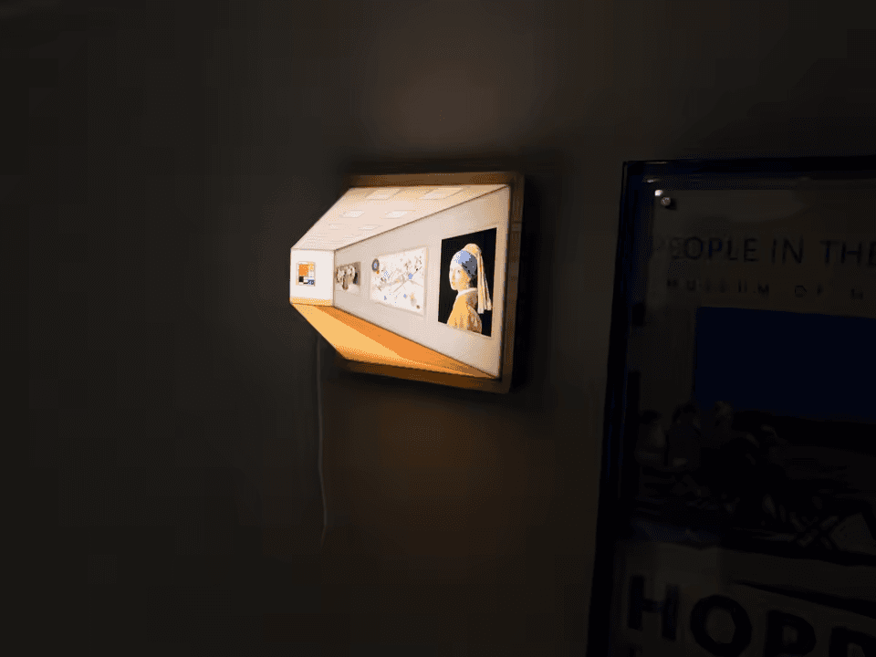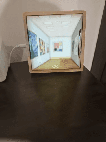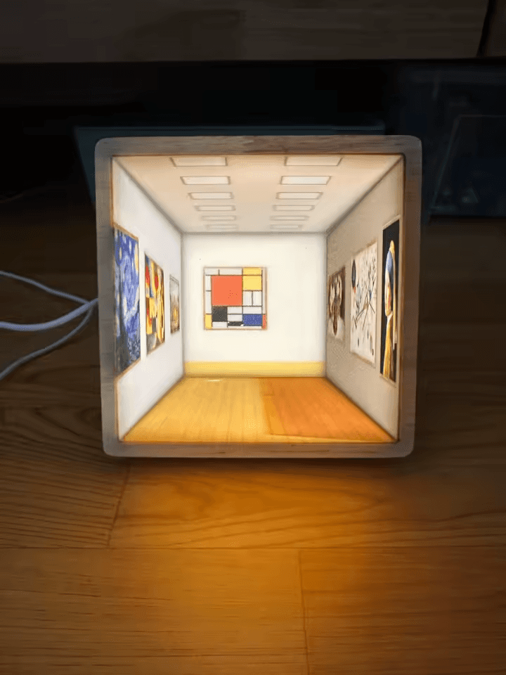 This extraordinary piece reimagines ambient lighting through sophisticated trompe-l'oeil technique, creating the illusion of depth and dimension within a compact frame. The carefully rendered perspective draws your eye into an impossibly deep corridor lined with masterpieces, transforming a simple nightlight into a portal to another space. Encased in a warm wooden frame with visible grain, the contrast between natural materiality and digital illusion creates captivating visual tension.